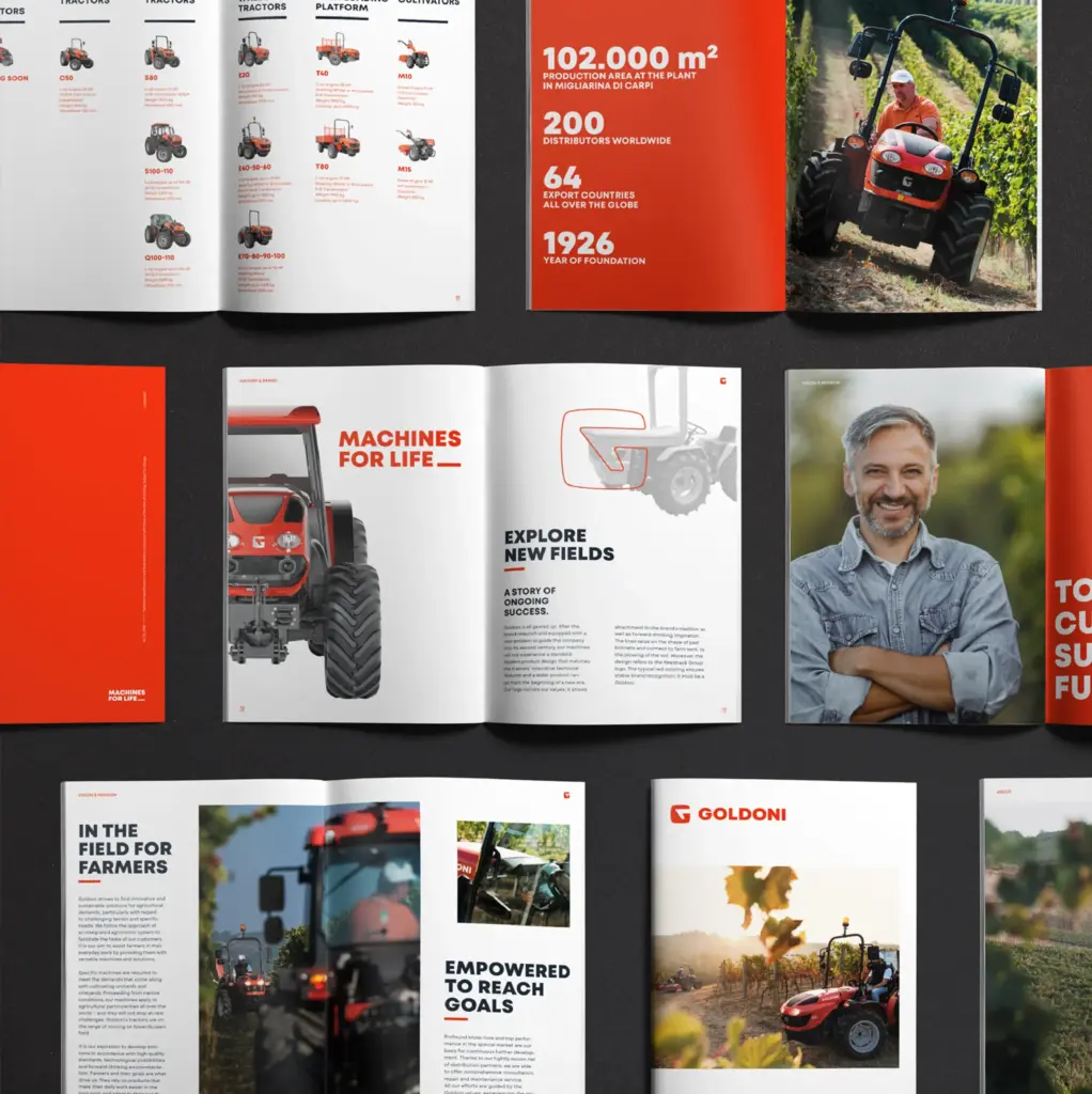 Die neue Bildmarke knüpft an die lange Designtradition von Goldoni an und schafft zugleich den Brückenschlag zu zukunftsweisenden Technologien. Das Gestaltungssystem für Typen- und Produktgruppen überträgt diese Haltung auf die gesamte Produktarchitektur – von der Fahrzeugkennzeichnung bis zum digitalen Auftritt. Das Ergebnis des Markenrelaunches: eine dynamische und intuitiv anwendbare Gestaltungsmatrix.